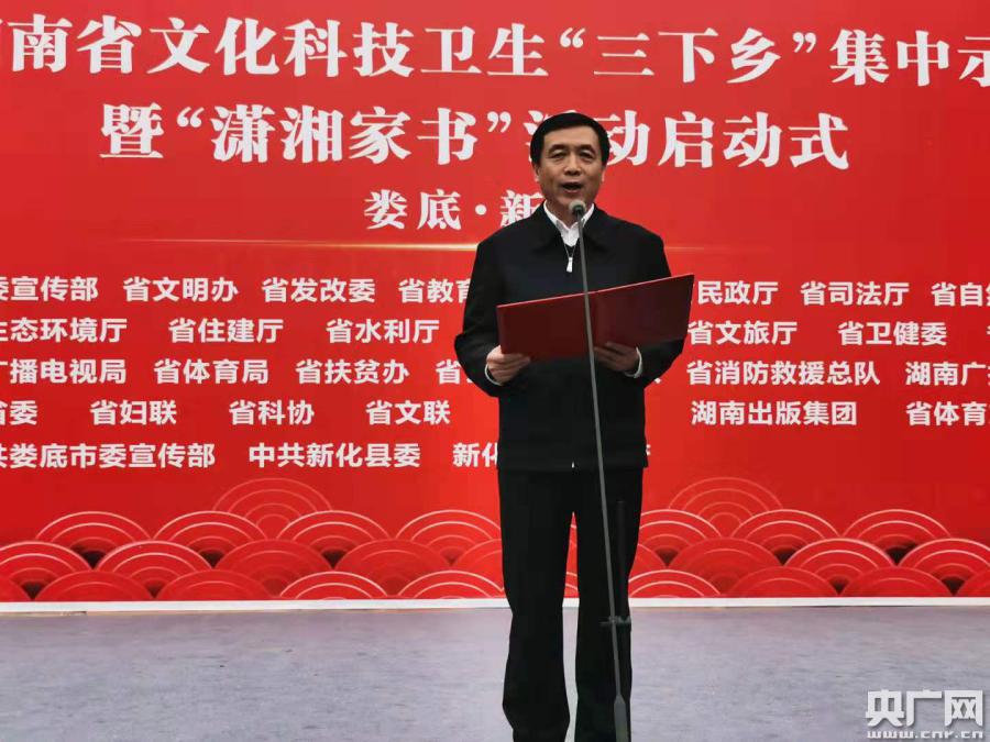 央廣網(wǎng)長(zhǎng)沙1月9日消息(記者鄧文輝)1月8日下午,2020年湖南省文化科技衛(wèi)生“三下鄉(xiāng)”集中示范活動(dòng)暨“瀟湘家書”活動(dòng)啟動(dòng)式,在湖南新化縣槎溪鎮(zhèn)朝陽(yáng)村易地扶貧安置點(diǎn)舉行。