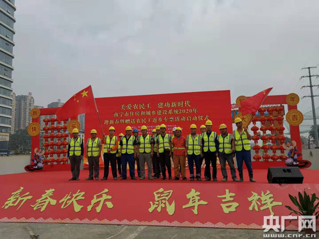 央廣網(wǎng)南寧1月9日(記者鄧君洋 通訊員梁詩菡)春節(jié)臨近,廣西南寧市住建局和市總工會(huì)不忘建筑工地一線進(jìn)城務(wù)工人員,組織局機(jī)關(guān)和市建筑質(zhì)量安全管理中心、市建設(shè)工會(huì)、中建五局廣西分公司、市城鄉(xiāng)建設(shè)信息中心、南寧軌道交通集團(tuán)有限責(zé)任公司、廣西運(yùn)德汽車運(yùn)輸集團(tuán)有限公司、市建設(shè)工程質(zhì)量安全協(xié)會(huì)等企事業(yè)單位,在由中建五局廣西公司承建的地鐵5號(hào)線03標(biāo)土建14工區(qū)項(xiàng)目部舉辦了2020年“關(guān)愛農(nóng)民工建功新時(shí)代”迎新春聯(lián)誼暨贈(zèng)送農(nóng)民工返鄉(xiāng)車票活動(dòng)啟動(dòng)儀式。