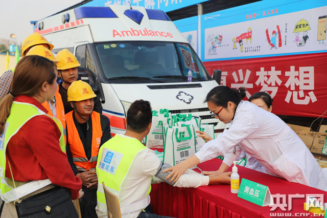 廣西工人醫(yī)院醫(yī)生在給工人師傅做體檢(央廣網(wǎng)發(fā) 照片由中建五局廣西公司提供)