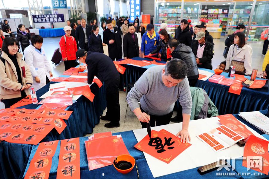 央廣網(wǎng)昆明1月11日消息(記者李健飛 通訊員鄧瑜 楊紫軒)1月10日9時(shí)30分,在昆明站候車大廳一個(gè)三角形的展臺前,吸引了很多旅客駐足觀看,來自中國鐵路昆明局集團(tuán)的書法愛好者正在為旅客寫春聯(lián)、送福字;隨后9時(shí)46分在優(yōu)美的音樂聲中,及主持人的介紹下,昆明局集團(tuán)2020年春運(yùn)“送萬福 進(jìn)萬家”“美好春運(yùn) 金花相伴”主題服務(wù)等活動在昆明站候車大廳拉開序幕。來自中國鐵路昆明局集團(tuán)昆明客運(yùn)段、昆明機(jī)務(wù)段、昆明站的鐵路職工在車站及部分列車上用自己的歌舞、技能表演,新老乘務(wù)員春運(yùn)工作交接等形式為旅客展示鐵路職工不一樣的春運(yùn)服務(wù)風(fēng)貌。