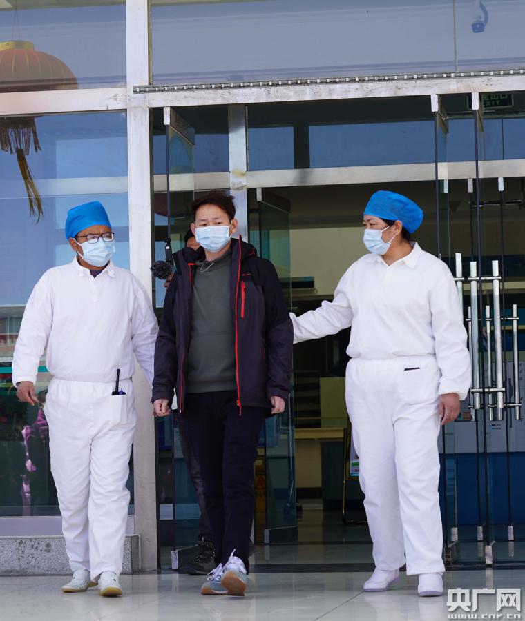 治愈患者在醫(yī)護(hù)人員的陪伴下走出醫(yī)院大樓(央廣網(wǎng)記者 羅布次仁 攝)