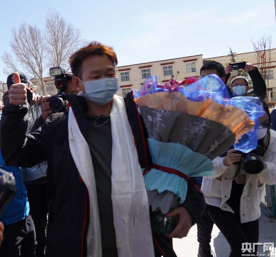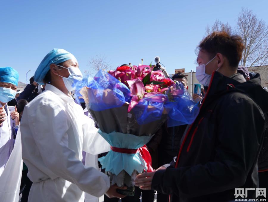 醫(yī)護(hù)人員為出院患者獻(xiàn)花(央廣網(wǎng)記者 羅布次仁 攝)