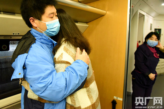 車廂里,兩人相擁在一起,“中午記得吃飯!薄昂人畷r(shí),水溫杯在包里。”“不要擔(dān)心我,這邊醫(yī)院也需要你,保重好自己!闭九_(tái)鈴聲響起,前來送行的同事和福州火車站工作人員向陳建華揮手道別。在不舍的離別情里,列車駛向武漢。