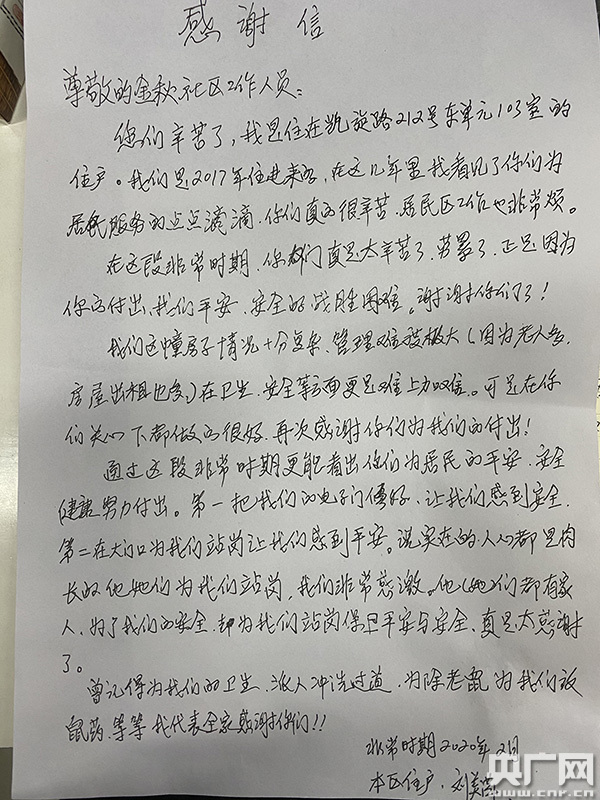 央廣網(wǎng)杭州2月16日消息(記者魏煒 通訊員高宇)“說實(shí)在的,人心都是肉長的,他們?yōu)槲覀冋緧,我們非常感激!他們都有家人,為了我們的安全,卻為我們站崗保衛(wèi)平安與安全,真的太感謝了!”近日,江干區(qū)凱旋街道金秋花園社區(qū)收到了一封社區(qū)居民送來的感謝信。雖然只是薄薄的一張紙,但滿滿紙面的文字勝過千言萬語,這是居民群眾對社區(qū)工作的認(rèn)可和肯定。這一份心意被分享在社區(qū)工作群中,讓身在“前方”和“后方”的大家都備受鼓舞。