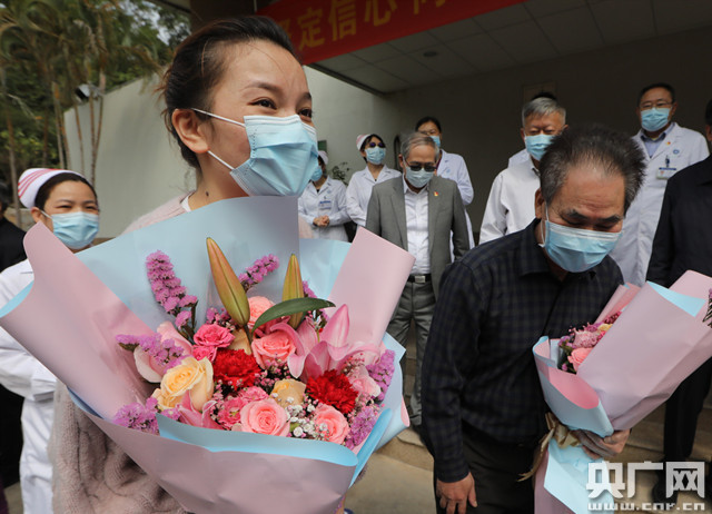 上午10點(diǎn)30分,當(dāng)兩名患者走出病區(qū),護(hù)士代表立即送上了鮮花。34歲的女患者陸某一直在擦眼淚,另一名患者羅老伯用廣東話不停表達(dá)自己的感謝。“回去后一定要注意休息,保重好身體”,中大五院院長(zhǎng)單鴻向他們送上祝福。