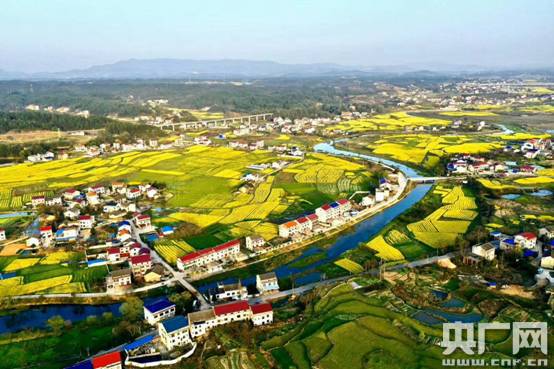 金黃的油菜花與村莊相映成趣,交織成一幅美麗清新的鄉(xiāng)村圖畫(huà)(央廣網(wǎng)發(fā) 嚴(yán)伯霖 攝)