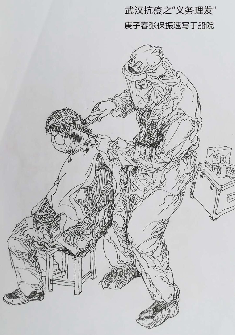 康復(fù)驛站工作人員張保振記錄覃垚理發(fā)創(chuàng)作的速寫(央廣網(wǎng)發(fā) 重慶市消防救援總隊彭水大隊供圖)