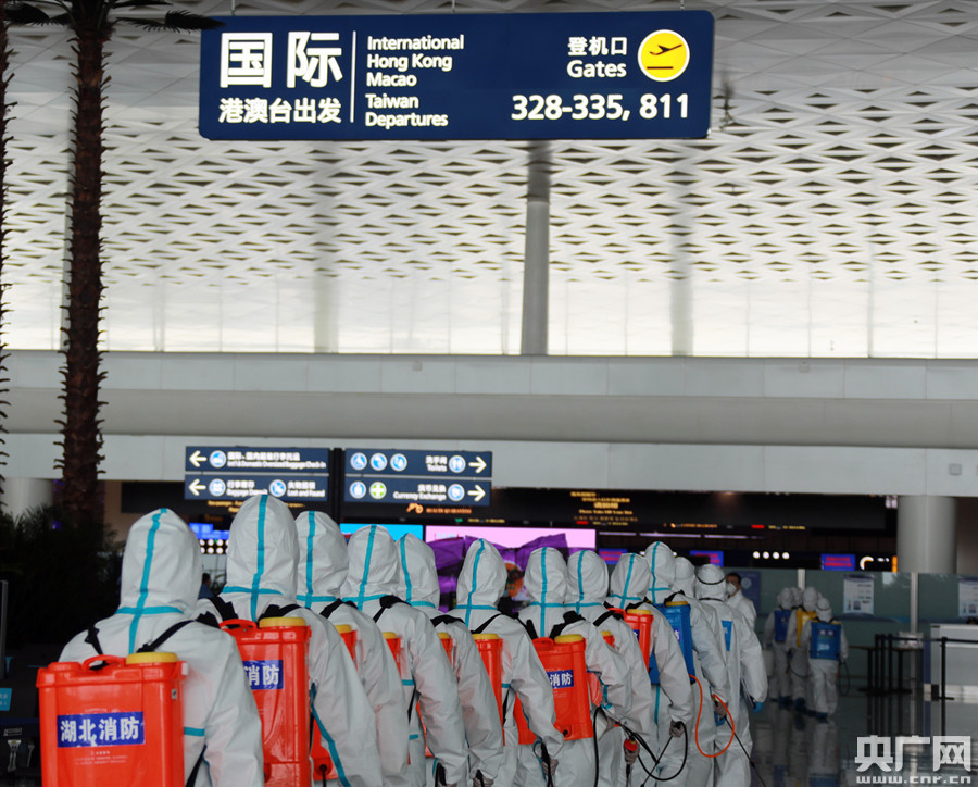 央廣網(wǎng)武漢4月4日消息(記者左艾甫 通訊員王方)為給乘客營造安全健康的乘機環(huán)境,4月3日下午,武漢市消防救援支隊160名隊員穿好防護服,分成16組,對武漢天河國際機場T3航站樓內(nèi)的服務(wù)臺、值機柜臺、安檢通道、候機區(qū)、商業(yè)經(jīng)營區(qū)、登機口、登機橋及公共區(qū)域進行全方位的消殺。