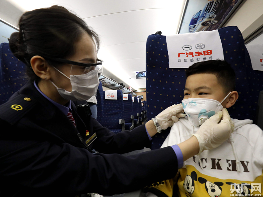 乘務員為小旅客整理口罩(央廣網發(fā) 通訊員張貴鋒 攝)