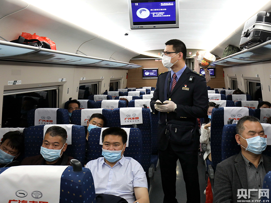 同時,乘務員及時提醒旅客戴好口罩,盡量減少走動次數(shù),并嚴格按照疫情防控要求為旅客測量體溫;保潔員增加電茶爐、洗臉間、各位置扶手等位置的擦拭消毒次數(shù),通力協(xié)作,把疫情防控工作落實到位,確保旅客的乘車安全。