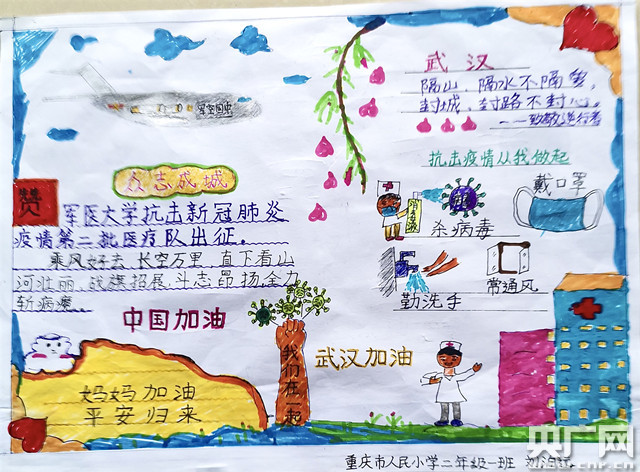 在媽媽武漢抗疫期間,兒子劉泊遠堅持每天與媽媽視頻連線,告訴外婆宅在家里發(fā)明的新菜式,匯報每天學習的內(nèi)容,與媽媽分享寫的稚嫩的日記。在李莎莎馳援武漢一周的時候,兒子將一幅親手繪制的畫報送給媽媽,畫報中有媽媽到武漢搭乘的“胖妞”大飛機,有媽媽穿防護服在一線戰(zhàn)斗的樣子,也有新型冠狀病毒被消滅的樣子,并且還不忘提醒大家勤洗手、戴口罩,特別是還在畫報中寫到:媽媽加油,平安歸來!