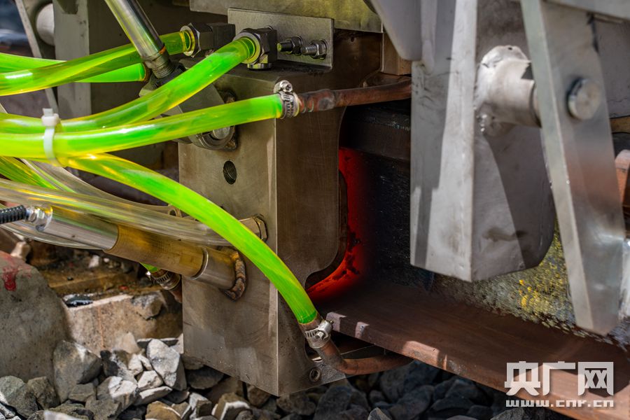 焊接好的長(zhǎng)鋼軌正在進(jìn)行雙頻電正火(央廣網(wǎng)發(fā) 通訊員供圖)