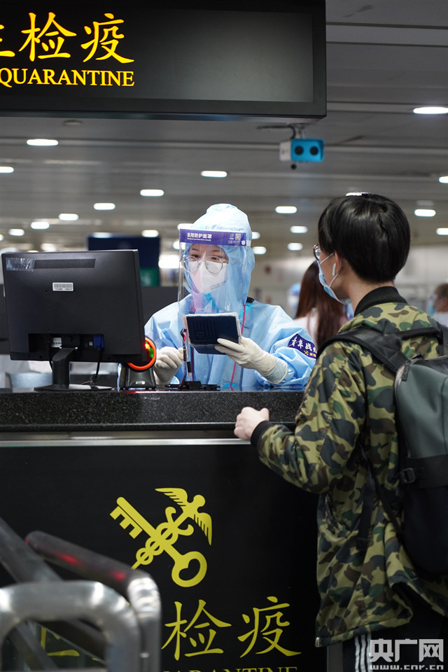 廣州海關(guān)所屬廣州白云機(jī)場海關(guān)關(guān)員掃描旅客檔案條碼錄入體溫檢測結(jié)果(央廣網(wǎng)發(fā) 邵子成 攝)