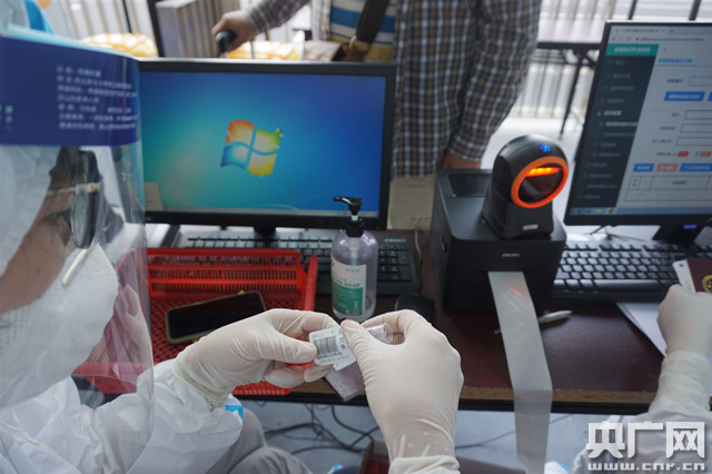 廣州海關(guān)所屬廣州白云機(jī)場海關(guān)關(guān)員打印旅客檔案條碼所關(guān)聯(lián)的標(biāo)簽并粘貼在旅客鼻咽拭子樣本管上(央廣網(wǎng)發(fā) 陳喬 攝)