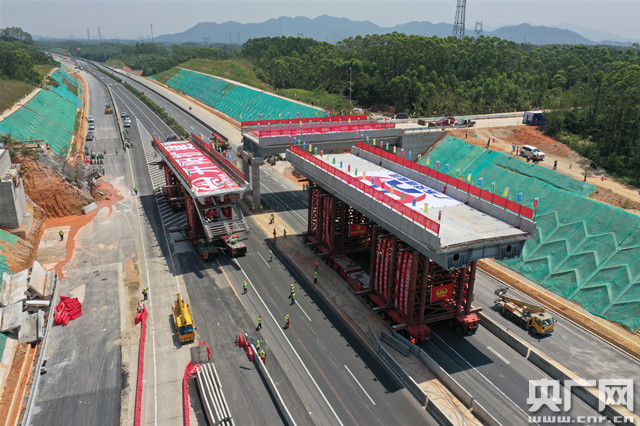 央廣網(wǎng)廣州5月10日消息(記者郭翔宇 通訊員粵交綜)在開陽高速北慣至奕洞段的天橋施工現(xiàn)場,14組智能模塊車快速往返作業(yè)。3個(gè)多小時(shí)后,3座舊天橋被拆除,1座新的天橋被迅速搭建起來……這是全國首個(gè)采用SPMT模塊智能移運(yùn)技術(shù)同步拆建天橋的高速公路改擴(kuò)建項(xiàng)目。