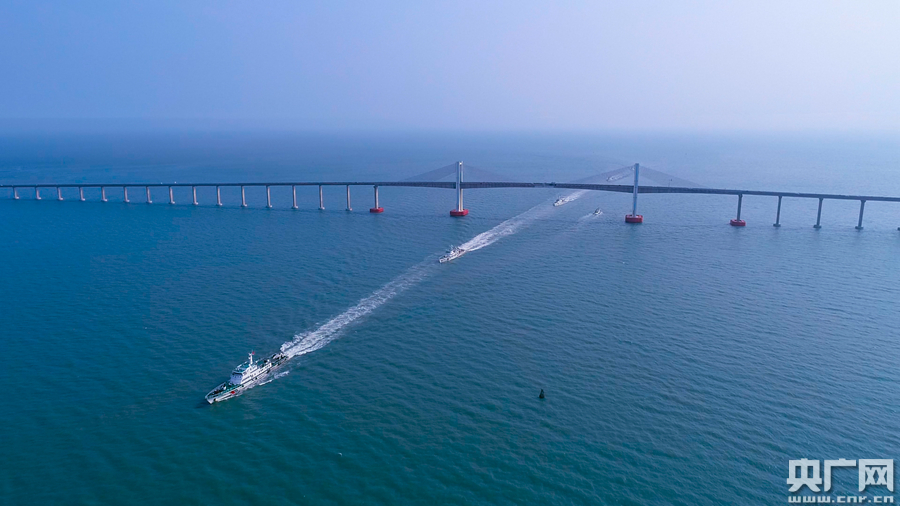 圖為汕頭海警局編隊(duì)艦艇經(jīng)過(guò)汕頭南澳大橋(央廣網(wǎng)發(fā) 汕頭海警局供圖)