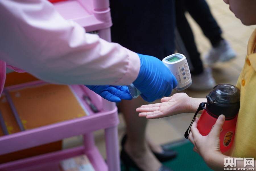 李宏說,在開學(xué)的第一天,幼兒園特別為每一個(gè)幼兒準(zhǔn)備了一個(gè)小音樂盒,作為小禮物,消除幼兒們長時(shí)間沒有回來的心理畏懼。同時(shí),在進(jìn)入幼兒園時(shí),除了對(duì)幼兒們進(jìn)行體溫檢測(cè),還加大了常見急性傳染病防控力度,特地增設(shè)了晨檢的環(huán)節(jié)。李宏介紹,“進(jìn)園前的安全檢查就會(huì)多一個(gè)程序,我們叫晨檢。家長要陪著小孩子走到門口以后,我們有衛(wèi)生保健醫(yī)生,跟小孩子先量體溫,量完體會(huì)就要檢查,五官,包括他的口腔,看一下他的里面有沒有口腔潰瘍,還看看有沒有眼睛發(fā)紅,我們不光是量體溫,是幼兒園的一個(gè)特點(diǎn)!