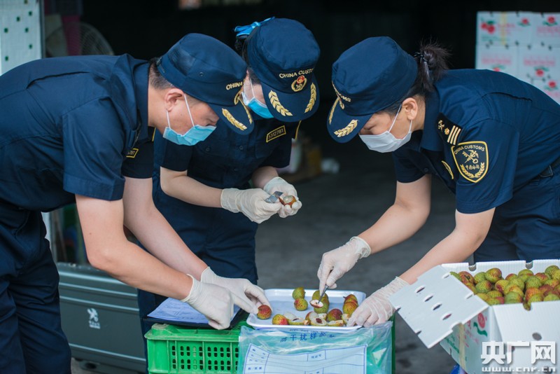 海關(guān)關(guān)員對(duì)出口荔枝采樣進(jìn)行檢查圖張仕榮(央廣網(wǎng)發(fā) 通訊員供圖)