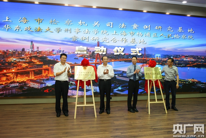 央廣網(wǎng)上海6月10日消息(記者周洪)6月10日,“上海市檢察機(jī)關(guān)司法案例研究基地”在楊浦區(qū)檢察院啟動(dòng)揭牌,案例研究基地致力研發(fā)的“指導(dǎo)性、參考性司法案例查詢系統(tǒng)”也同一時(shí)間在楊浦區(qū)院上線試運(yùn)行;顒(dòng)中,4名檢察業(yè)務(wù)專家受聘成為基地首批顧問,18名理論學(xué)者和優(yōu)秀檢察官骨干成為基地首批特約研究員。上海市檢察院副檢察長陶建平、華東政法大學(xué)黨委副書記應(yīng)培禮、楊浦區(qū)檢察院檢察長譚濱、上海市法學(xué)會(huì)案例法學(xué)研究會(huì)會(huì)長、華東政法大學(xué)刑事法學(xué)院院長孫萬懷等人出席揭牌儀式。
