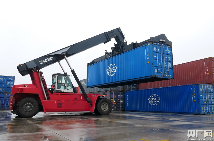 7月24日,作業(yè)人員在西安新筑車站貨場(chǎng)吊運(yùn)中歐班列集裝箱。(央廣網(wǎng)發(fā) 唐振江 攝)