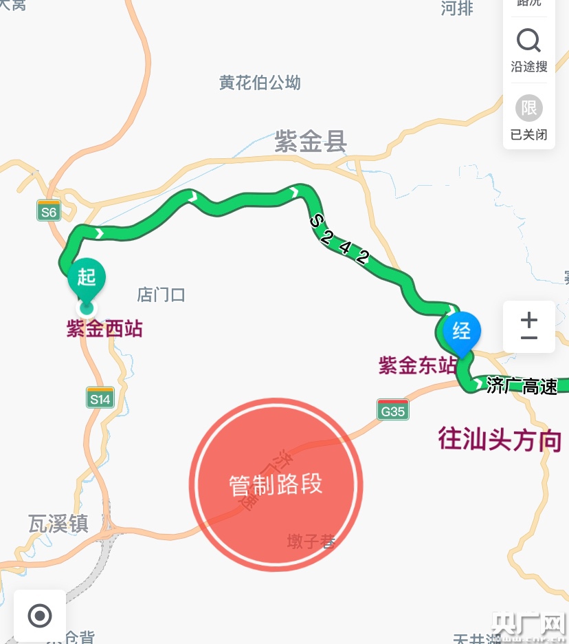 封閉期間,汕頭往廣州方向車輛需從紫金東站駛出高速,繞行至S242省道再轉(zhuǎn)入S120省道在紫金西站上高速;