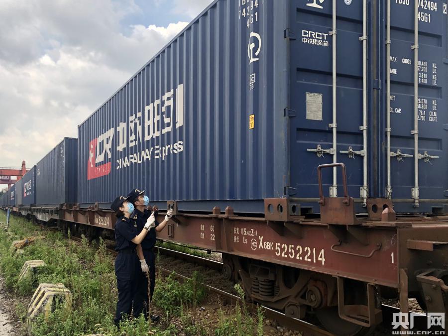廣州海關所屬廣州車站海關關員對發(fā)運前的班列集裝箱標識號進行核查 (央廣網(wǎng)發(fā) 海關供圖)