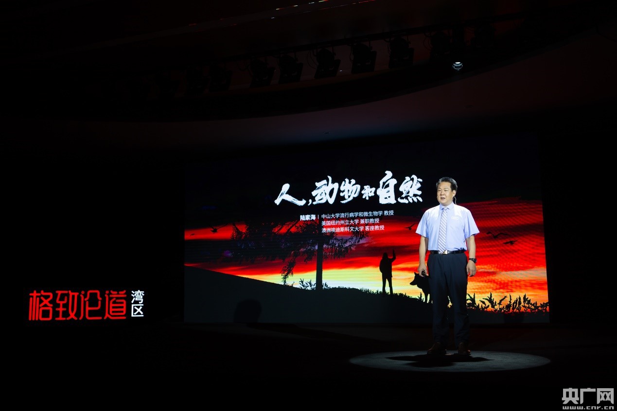 第一位出場的是2003年非典期間世界衛(wèi)生組織特邀專家,中山大學公共衛(wèi)生學院的陸家海教授,他曾深入抗擊非典、禽流感和新冠肺炎的第一線,花了20年的時間,追蹤人類發(fā)展史和傳染病的關(guān)系,建立重大疫情預(yù)警系統(tǒng)。他從歷史上的鼠疫說起,用生動的語言揭開人類和大自然、動物之間密不可分的關(guān)聯(lián)。他在演講中提到,人類超過70%的傳染病來源于野生動物,人類健康不單單是人類的事情,還跟動物健康和環(huán)境健康密切相關(guān),呼吁大家都參與到野生動物保護中來,他倡導(dǎo)防控傳染病的新理念“同一健康”(One health)引發(fā)了觀眾強烈的共鳴。