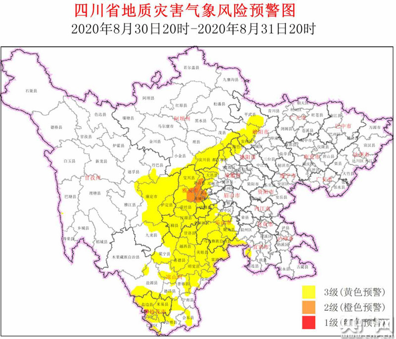 2級橙色預(yù)警區(qū)域為雅安寶興縣、天全縣、蘆山縣、名山區(qū)、雨城區(qū)、滎經(jīng)縣。