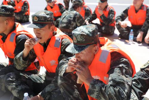 武警戰(zhàn)士在休息點(diǎn)簡陋就餐(圖片攝影:張華釗)