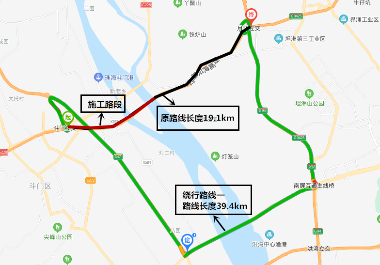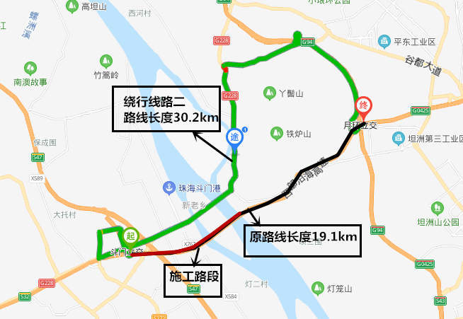 具體繞行路線:斗門立交–江珠高速–珠海大道–南屏互通-廣珠西線高速-月環(huán)立交-西部沿海高速。
