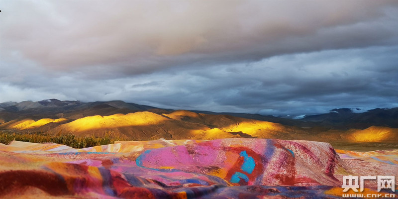央廣網(wǎng)廣州9月20日消息(記者何偉奇)83件巨幅畫作,由57頭牦牛馱負著,沿著山坡曲線,在陽光、藍天、白云、雪山、曠野和風共同創(chuàng)構的場域中,搭設成一道寄予著人們美好祈愿的彩虹,面對珠穆朗瑪山峰徐徐展開。這是華南理工大學建筑學院美術教研室主任、視覺藝術實驗室主任王義明帶領著廣東藝術團隊9月18-19日在西藏日喀則崗嘎鎮(zhèn)展開的人與自然合力創(chuàng)作。