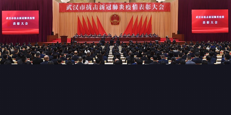 會場氣氛莊嚴(yán)熱烈。主席臺上方懸掛著“武漢市抗擊新冠肺炎疫情表彰大會”會標(biāo);后幕正中是熠熠生輝的中華人民共和國國徽,10面紅旗分列兩側(cè);會場后側(cè)豎起巨幅標(biāo)語:“緊密團(tuán)結(jié)在以習(xí)近平同志為核心的黨中央周圍,大力弘揚偉大抗疫精神,主動作為,奮發(fā)有為,為加快建設(shè)國家中心城市,打造國際化大都市努力奮斗!”
