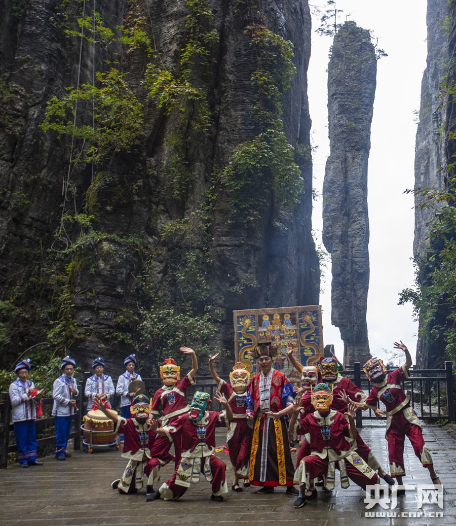 大峽谷“一炷香”景點處恩施儺戲表演(央廣網(wǎng)發(fā) 通訊員向艷攝)