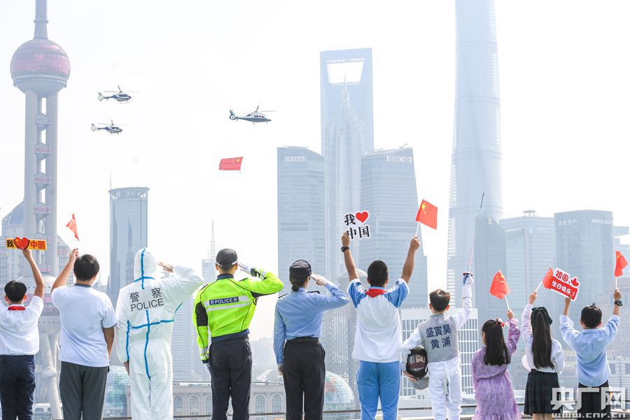 上午10時(shí),當(dāng)外灘鐘樓的鐘聲敲響之際,上海市公安局警務(wù)航空隊(duì)的三架警用直升機(jī)出現(xiàn)在了黃浦江上空,吸引了市民和游客駐足仰望,大家為之歡呼、為之雀躍,共同喜迎新中國71周年華誕。領(lǐng)航的H155警用直升機(jī)下方懸掛著一面6.45×4.3米的五星紅旗,迎風(fēng)飄揚(yáng)。兩架EC-135警用直升機(jī)在其后方分列左右護(hù)航,整個(gè)機(jī)隊(duì)呈“品”字型掠過黃浦江上空,馬達(dá)轟鳴,蔚為壯觀。