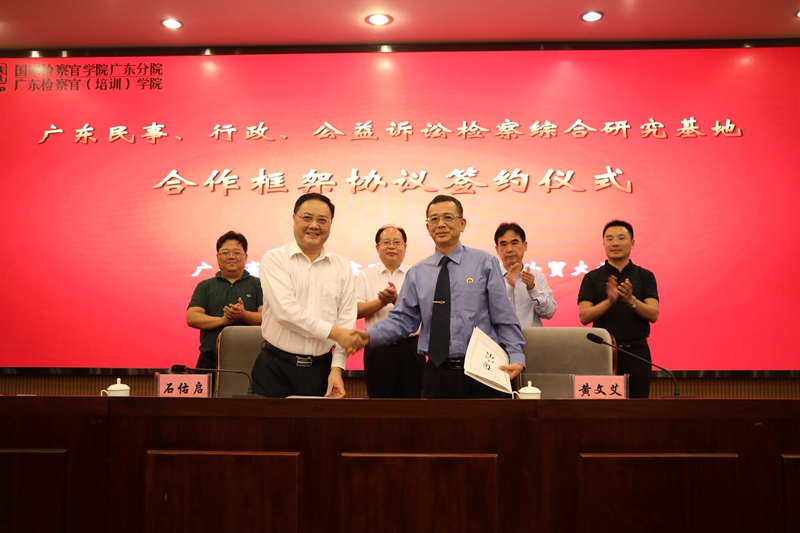 央廣網(wǎng)廣州10月19日消息(記者鄭澍 通訊員王磊)10月19日下午,廣東民事、行政、公益訴訟檢察綜合研究基地合作框架協(xié)議簽約儀式在國(guó)家檢察官學(xué)院廣東分院舉行,最高人民檢察院第七檢察廳廳長(zhǎng)張相軍蒞臨現(xiàn)場(chǎng)見(jiàn)證儀式。廣東省人民檢察院副檢察長(zhǎng)黃文艾、廣東外語(yǔ)外貿(mào)大學(xué)校長(zhǎng)石佑啟出席儀式并致辭,最高人民檢察院第七檢察廳辦公室主任馮孝科、廣東省人民檢察院第七檢察部主任馬謹(jǐn)斌、國(guó)家檢察官學(xué)院廣東分院常務(wù)副院長(zhǎng)林武衡出席簽約儀式。