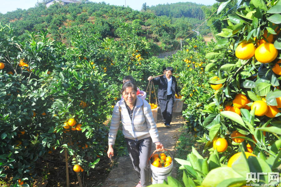 在江西省贛州市全南縣南逕鎮(zhèn)三峽移民新村蔡祖富的臍橙園,一家三口人高興地開始采摘臍橙(央廣網(wǎng)發(fā) 通訊員供圖)