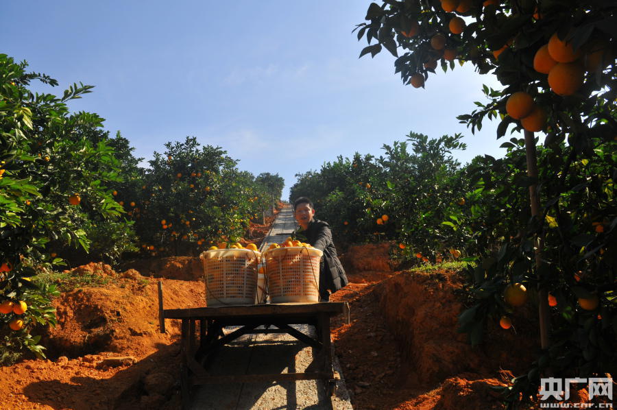 果農(nóng)自建了軌道臍橙運(yùn)輸車運(yùn)送臍橙,減輕了勞動(dòng)強(qiáng)度(央廣網(wǎng)發(fā) 通訊員供圖)