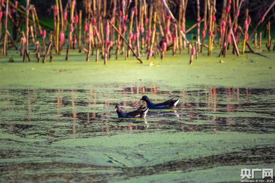 央廣網(wǎng)九江11月14日消息(記者謝元森 通訊員陳扶南 杜春泉)日前,在江西省鄱陽(yáng)湖都昌縣磯山湖水產(chǎn)基地“魚藕共作”的精養(yǎng)池內(nèi),棲息著一群黑水雞、斑嘴鴨、綠頭鴨、斑背潛鴨等近百只野生水鳥,它們?cè)谶@里覓食、嬉戲,形成一幅別樣的“雞鴨成群”的美景。