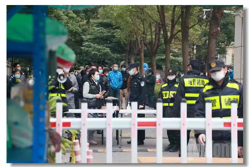 當(dāng)晚20時,沈維和同事們“全副武裝”做好防護措施后一起趕到小區(qū)內(nèi),配合醫(yī)務(wù)人員維持臨時檢測點的秩序,同時和居委工作人員一起挨家挨戶通知住戶前去接受檢測。對于發(fā)現(xiàn)病例的52號樓,所有人都敬而遠之,于是沈維和同事主動承擔(dān)起了這里居民的核查工作。小區(qū)居民完成檢測已是半夜時分,沈維忙碌了幾個小時仍未停歇,考慮到當(dāng)天是工作日,部分居民陸續(xù)回家可能還未做檢測,他和同事再次逐棟走訪,一家一家確認檢測情況,這一忙就到了早上8點。