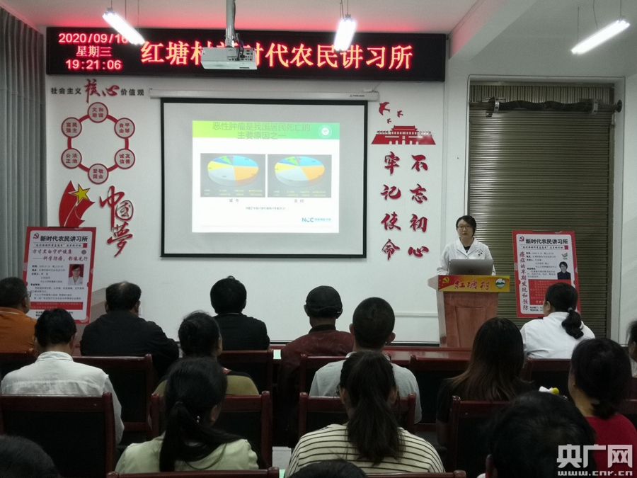 2020年9月16日,中山大學(xué)腫瘤防治中心孔亞楠醫(yī)生在紅塘村“新時代農(nóng)民講習(xí)所”做癌癥早期篩查健康科普講座(央廣網(wǎng)發(fā) 張國宇 攝)