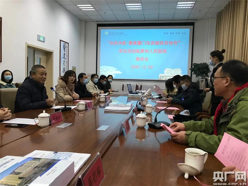 臨夏州人民醫(yī)院向采訪(fǎng)團(tuán)介紹廈門(mén)“組團(tuán)式”幫扶經(jīng)驗(yàn)做法(央廣網(wǎng)記者 陳庚 攝)