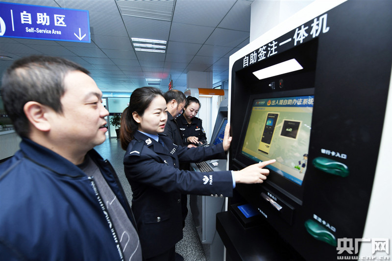 保康民警正指導(dǎo)市民通過(guò)自助簽注一體機(jī)辦理簽注業(yè)務(wù)(央廣網(wǎng)發(fā) ?倒补﹫D)