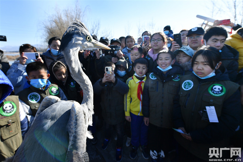 志愿者在科普并放飛當?shù)刈匀毁Y源局救護的國家三有保護鳥類蒼鷺(央廣網(wǎng)發(fā) 王海濱 攝)