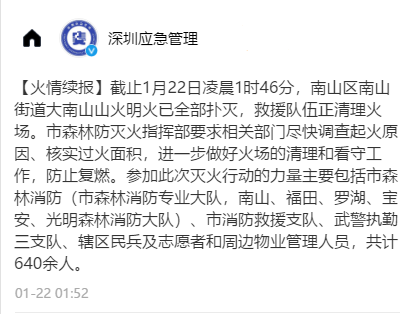 深圳市南山區(qū)大南山于1月21日20時(shí)20分突發(fā)山火,全市共派出救火人員共計(jì)640人,此次大火無人員傷亡,無重要設(shè)施受影響。