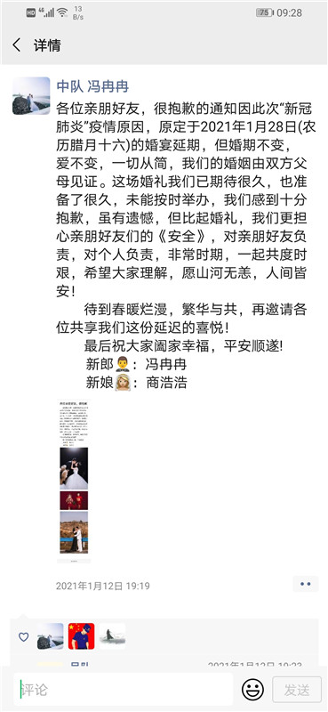 1月12日晚上,邯鄲磁縣消防救援大隊消防隊員馮冉冉在朋友圈宣布,他的婚禮將要推遲……