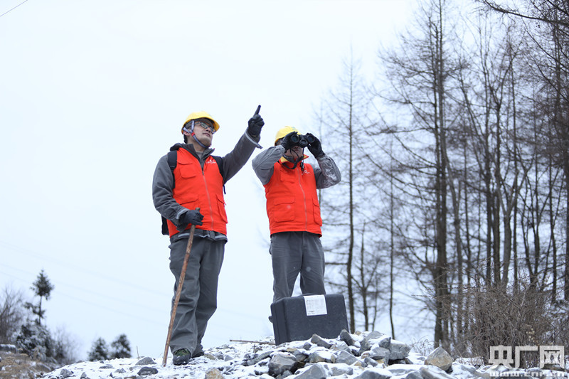 “以雪為令、迎雪而上”。積雪的路面透露出未知和危險(xiǎn),李相如和同事周良每走一段路,樹(shù)上的雪便會(huì)簌簌地掉下!斑@里很滑,要小心一點(diǎn),不要踩在凍土上,找雪厚的地方下腳!弊咴谧钋懊娴娜,總是會(huì)提前用腳試試雪,看是不是實(shí)土,再提醒后面的人沿著他走過(guò)的路前進(jìn)。然而,比起腳踏雪地,他們更小心的是手中的測(cè)量設(shè)備。
