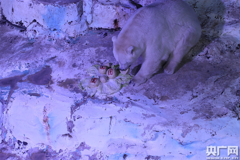 北極熊在“享用”特制元宵美食(央廣網(wǎng)記者 王偉 攝)