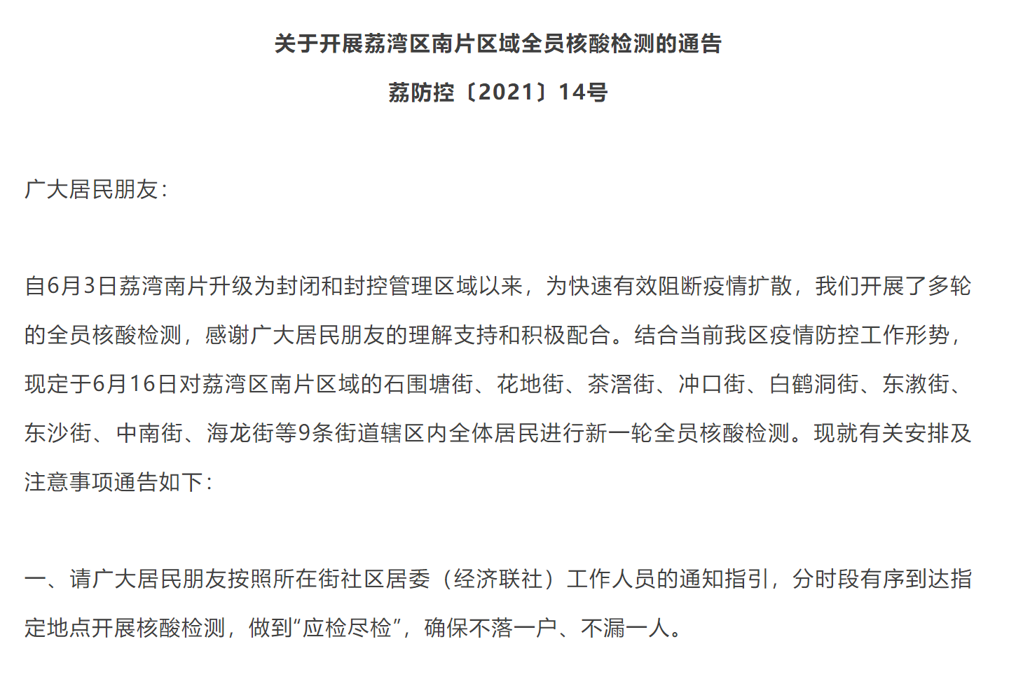 自6月3日荔灣南片升級為封閉和封控管理區(qū)域以來,為快速有效阻斷疫情擴散,我們開展了多輪的全員核酸檢測,感謝廣大居民朋友的理解支持和積極配合。結合當前我區(qū)疫情防控工作形勢,現(xiàn)定于6月16日對荔灣區(qū)南片區(qū)域的石圍塘街、花地街、茶滘街、沖口街、白鶴洞街、東漖街、東沙街、中南街、海龍街等9條街道轄區(qū)內(nèi)全體居民進行新一輪全員核酸檢測,F(xiàn)就有關安排及注意事項通告如下: