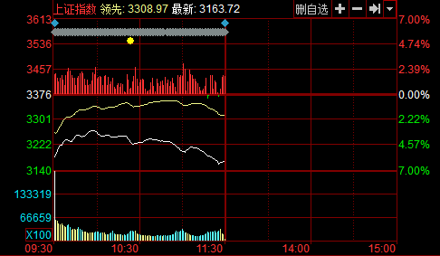 截至午盤(pán),滬指報(bào)3163.72點(diǎn),下跌212.78點(diǎn),跌幅6.3%,成交2685億元;深成指報(bào)10947.45點(diǎn),下跌585.35點(diǎn),跌幅5.08%,成交1781億元;創(chuàng)業(yè)板指數(shù)報(bào)1662.26點(diǎn),上漲2270點(diǎn),漲幅1.38%,成交372.7億元。