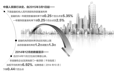 在全球超過10家央行于2015年降息后,2月28日,中國人民銀行決定,自2015年3月1日起下調(diào)金融機構(gòu)人民幣貸款和存款基準利率。金融機構(gòu)一年期貸款基準利率下調(diào)0.25個百分點至5.35%;一年期存款基準利率下調(diào)0.25個百分點至2.5%。